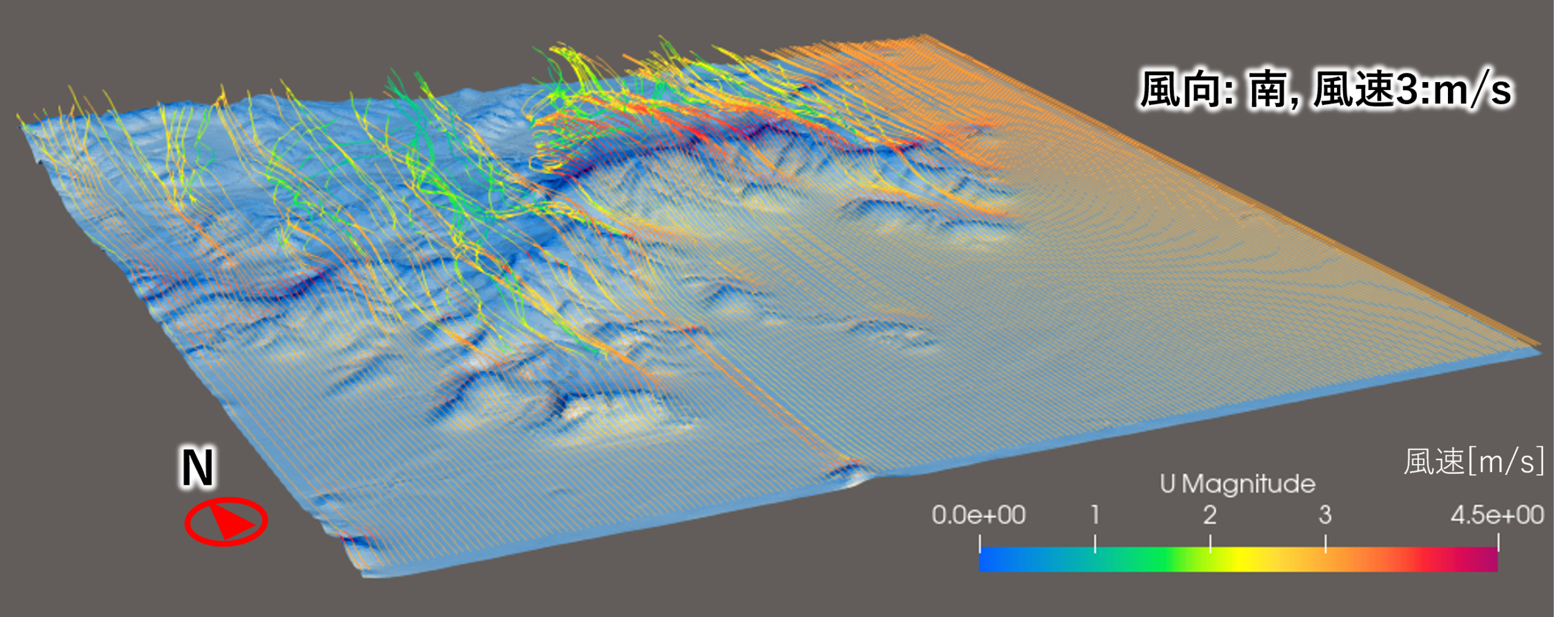 図4-1は、晃石山~大平山の風下側の風の流れを流線で可視化したものです。