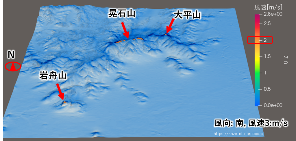 大平山一帯で、南風が生じさせる上昇(高度方向)気流が強い場所は3か所あり、晃石山山頂の両脇と大平山山頂付近、そして岩舟山の崖です。計算結果しては風の上昇成分の最大値は2.8m/sですが非常に局所的でわかりにくい為、図3-1では確認し易く上昇成分2.0m/sのエリアを示しています。山の稜線の赤で着色された部分が該当します。