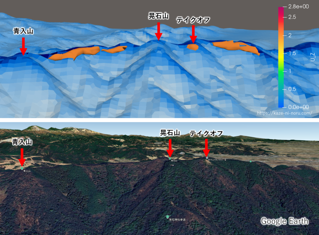 図3-2の計算モデルとGoogle Earthの比較から、晃石山の東側(図の右側)の上昇成分2.0m/s以上のエリアは、テイクオフがあるあたりであることがわかります。今回の計算結果から、大平山のテイクオフの位置は、パラグライダーが離陸しやすい場所のようです。実際に飛んだことが無いので推測の域を出ませんが、離陸後直後の高度稼ぐためにテイクオフの東側の上昇風帯は使えそうに見えます。しかし、晃石山の西側(図の左側)の上昇帯は、晃石山前の尾根を越えて行く必要があるので、使うのは難しそうですね。