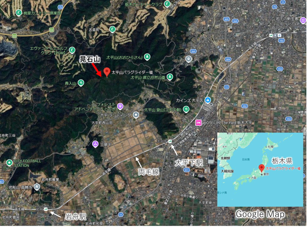 大平山や岩舟山の上昇気流帯は、テイクオフ(晃石山)から離れているので、パラグライダーで離陸後の高度稼ぎにこの上昇帯を使うのは難しいと考えられ、特に岩舟山は標高が低く、近くに線路やJR岩舟駅もあるので近づかない方が無難そうですね。