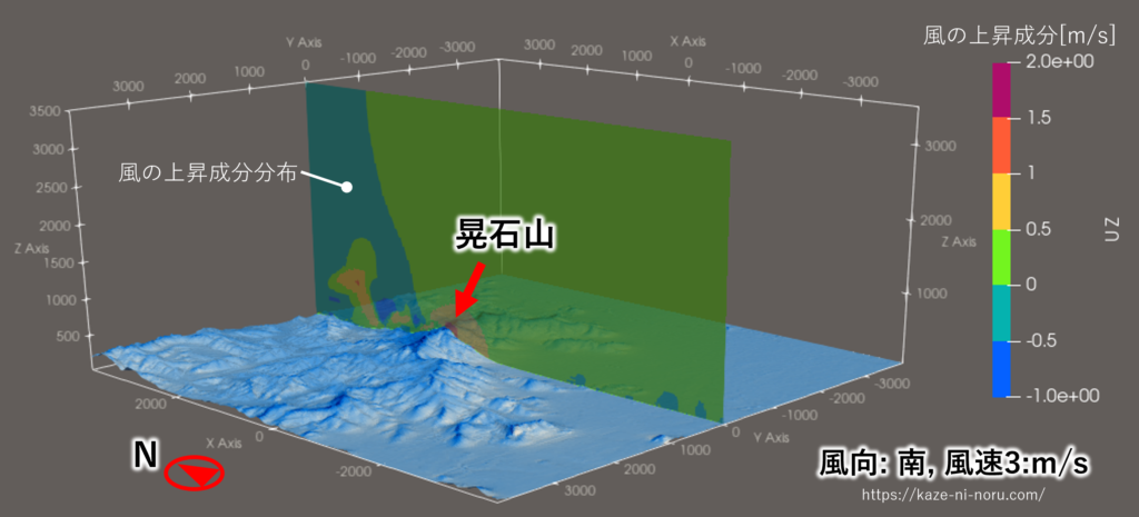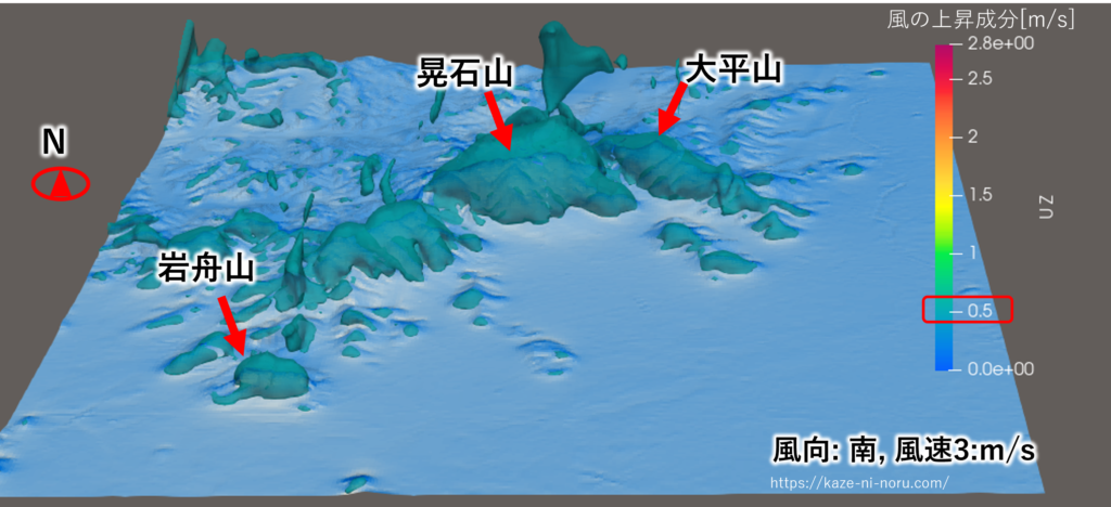 上では特に強い上昇気流が発生するエリアを紹介しましたが、基本的に山の南側斜面側から稜線の少し北側までは風の上昇成分はあり、例えば0.5m/s以上のエリアを可視化すると図3-3のようになります。