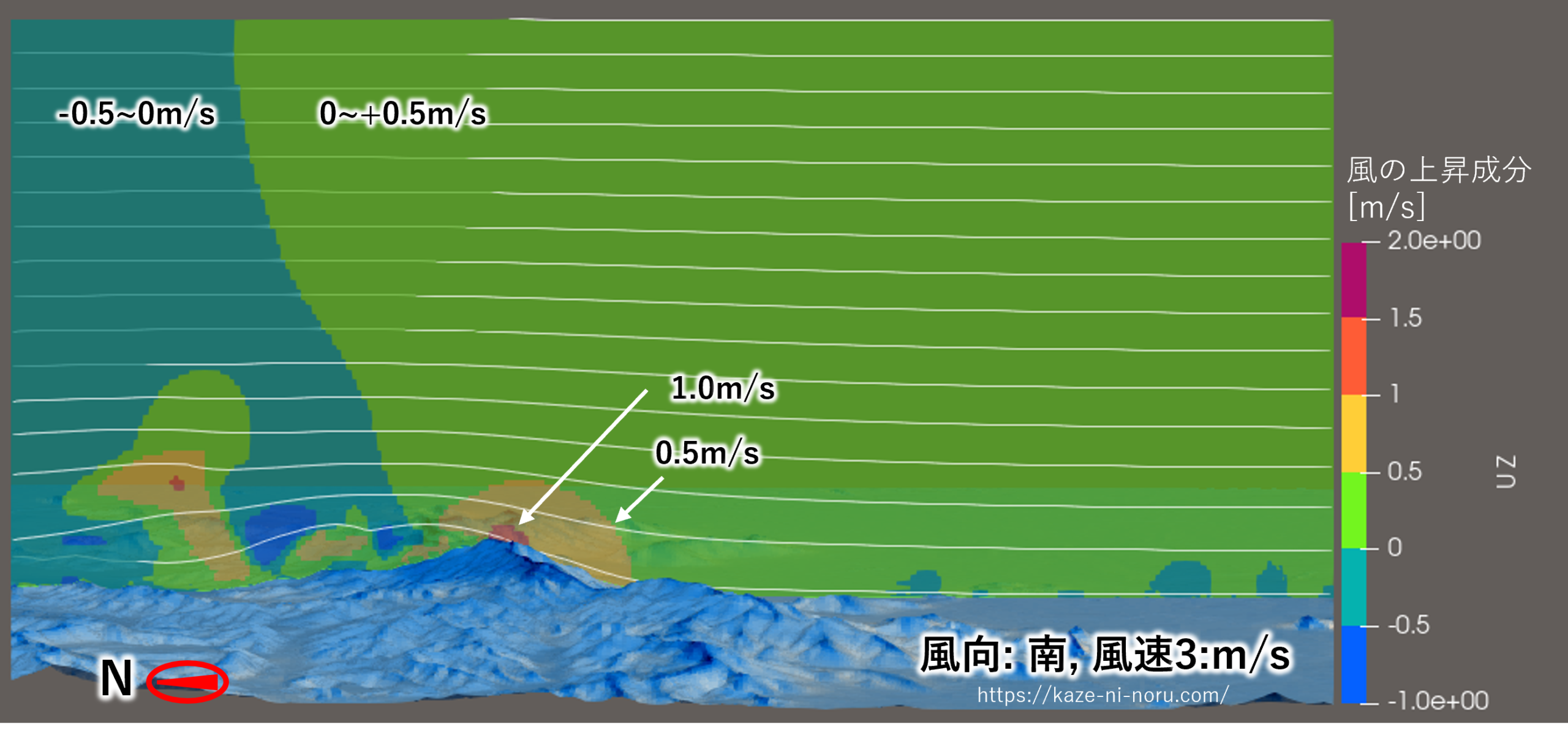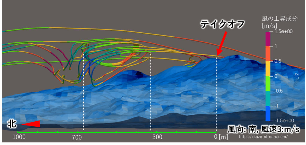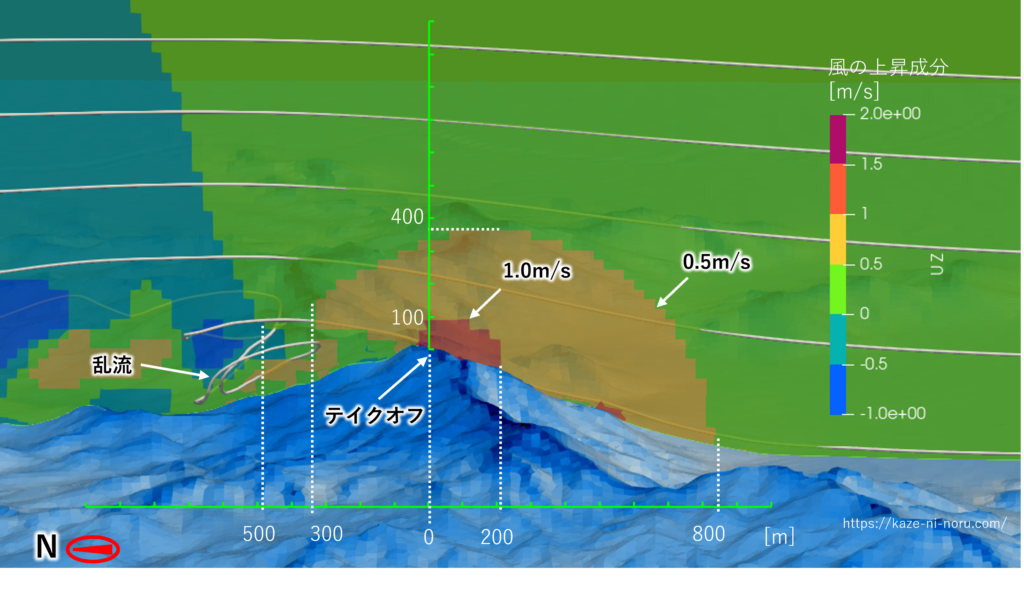 1.5m/s以上の強い上昇成分は山の近傍だけの為この図ではよくわかりませんが、上昇成分1.0m/sの範囲はテイクオフ上空100mまであり南側には200mまで広がるようで、ここで飛ぶ皆さんはテイクオフ直後はこの範囲で高度獲得のリッジソアリングをしているのかなと思います。