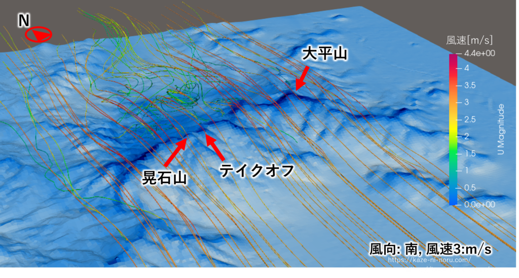 まずは図3-4でテイクオフ位置の大きな流れを見てみます。白い線は風の流線です。